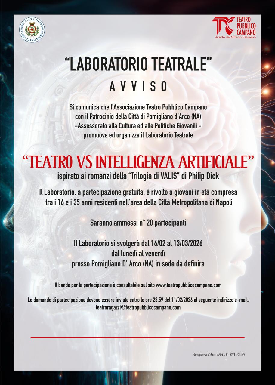 Ritorna il Laboratorio Teatro Pubblico Campano a Pomigliano D’ Arco. Il tema di quest’ edizione sarà Teatro Vs Intelligenza Artificiale, ispirato ai romanzi della “Trilogia di VALIS” di Philip Dick. Il laboratorio, diretto da Felice Panico, si svolgerà dal 16 febbraio al 13 marzo 2026 dal lunedì al venerdì ed e’ completamente gratuito. Se hai tra i 16 ed i 35 anni ed hai voglia di fare teatro con noi puoi inviare la tua domanda di partecipazione entro l’ 11 febbraio 2026 alla mail: teatroragazzi@teatropubblicocampano.com
